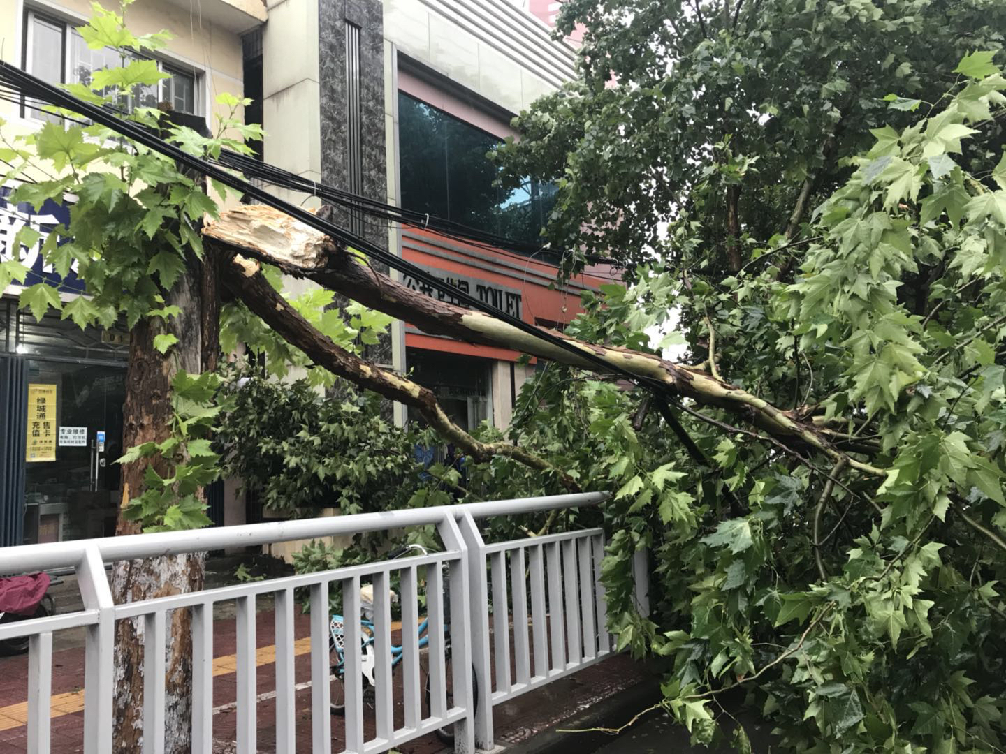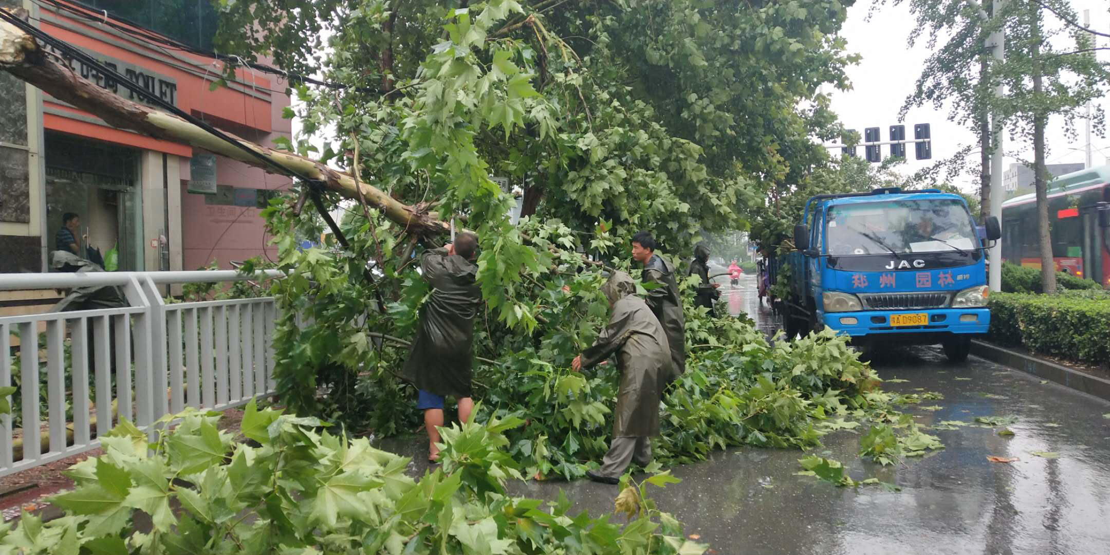 狂风暴雨中,郑州街头树木频频断裂