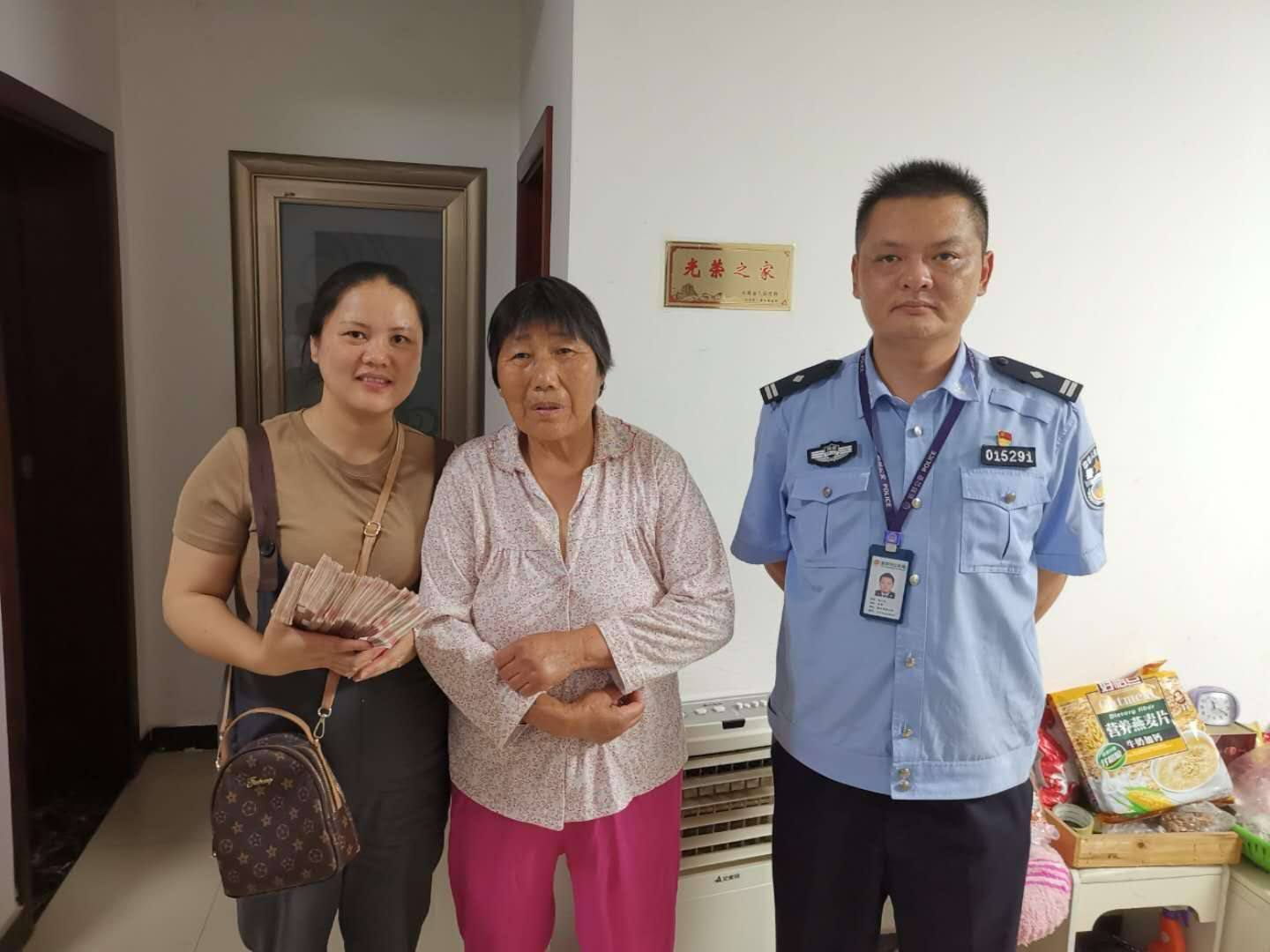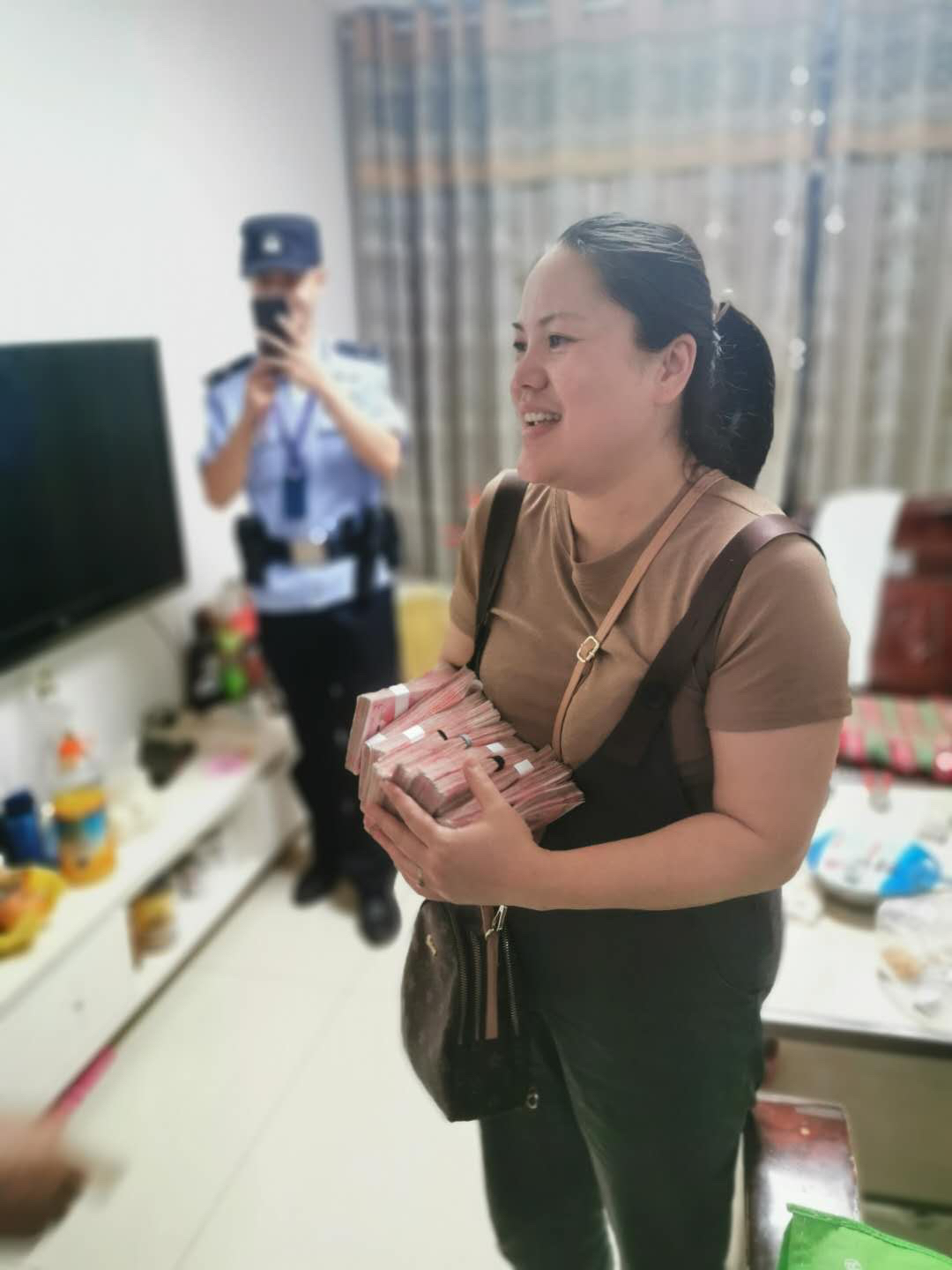 功夫不负有心人,民警经过对周边楼栋住户近一个小时的挨家挨户敲门寻找,终于在38号楼住户中找到该老太太,老太太以为是假币捡回来数了一个小时,经核实确认,正是该老太太拾到了10万元现金,经过民警耐心教育,老太太将十万元现金如数归还。