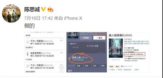当国家电影局的通知发出后,有网友发现,《唐人街探案3》《夺冠》在豆瓣网上更新了上映信息,显示两部影片将分别于8月14日和9月25日上映。但很快,《唐探3》导演陈思诚在微博直接辟谣,称这是假消息。