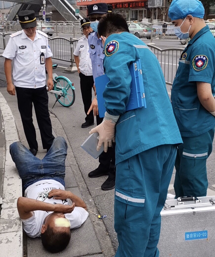 7月27日上午10时50分,二七区一马路街道巡防队员岳剑峰、于永进、丁广伟,巡逻到一马路与大同路交叉口时,发现一名穿白上衣的男子躺在地上一动不动,旁边的同伴不停地大声呼唤,想将该男子从地上扶起来,却拉不动该男子。看见巡防队员过来,男子的同伴忙上前求助说:“你们快帮帮忙吧,我朋友喝多了,躺在马路上太危险,你们能否帮忙把他抬到路边安全的地方?”