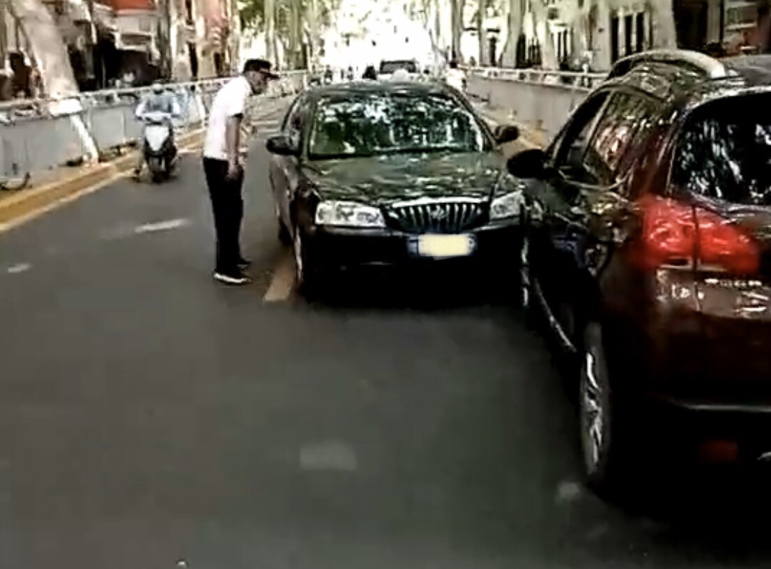 男子从医院出来后,发现自己的黑色轿车因溜车闯了祸,才想起自己下车时忘了拉手刹。两车相撞后,占据了马路上的两个车道,造成交通拥堵。在路上巡逻的中原区建设路办事处巡防队员发现后,立即上前疏导交通,指挥车辆绕行避让。