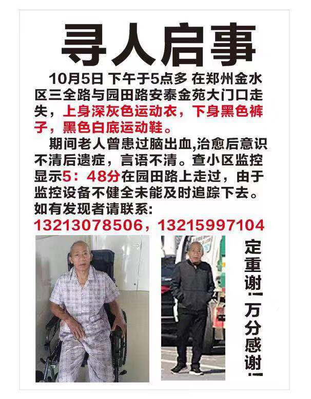 10月5日下午,郑州一老人在金水区三全路与园田路安泰金苑大门口走失,上身穿深灰色运动衣,下身穿黑色裤子,黑色白底运动鞋。老人曾患脑出血,家人急寻,如果看到请联系:13213078506,13215997104。