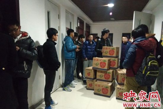 据了解,他们在12月8日确定具体数目及方案,22日购买了苹果,23日发放到河南财经政法大学各院系,由各班班长领取并通过寝室长发放到每个同学手里。