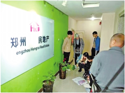 部分租户和房东来中介公司维权,到达12层电梯口,发现郑州恒瑞房地产“恒瑞”两个字已经被去掉。