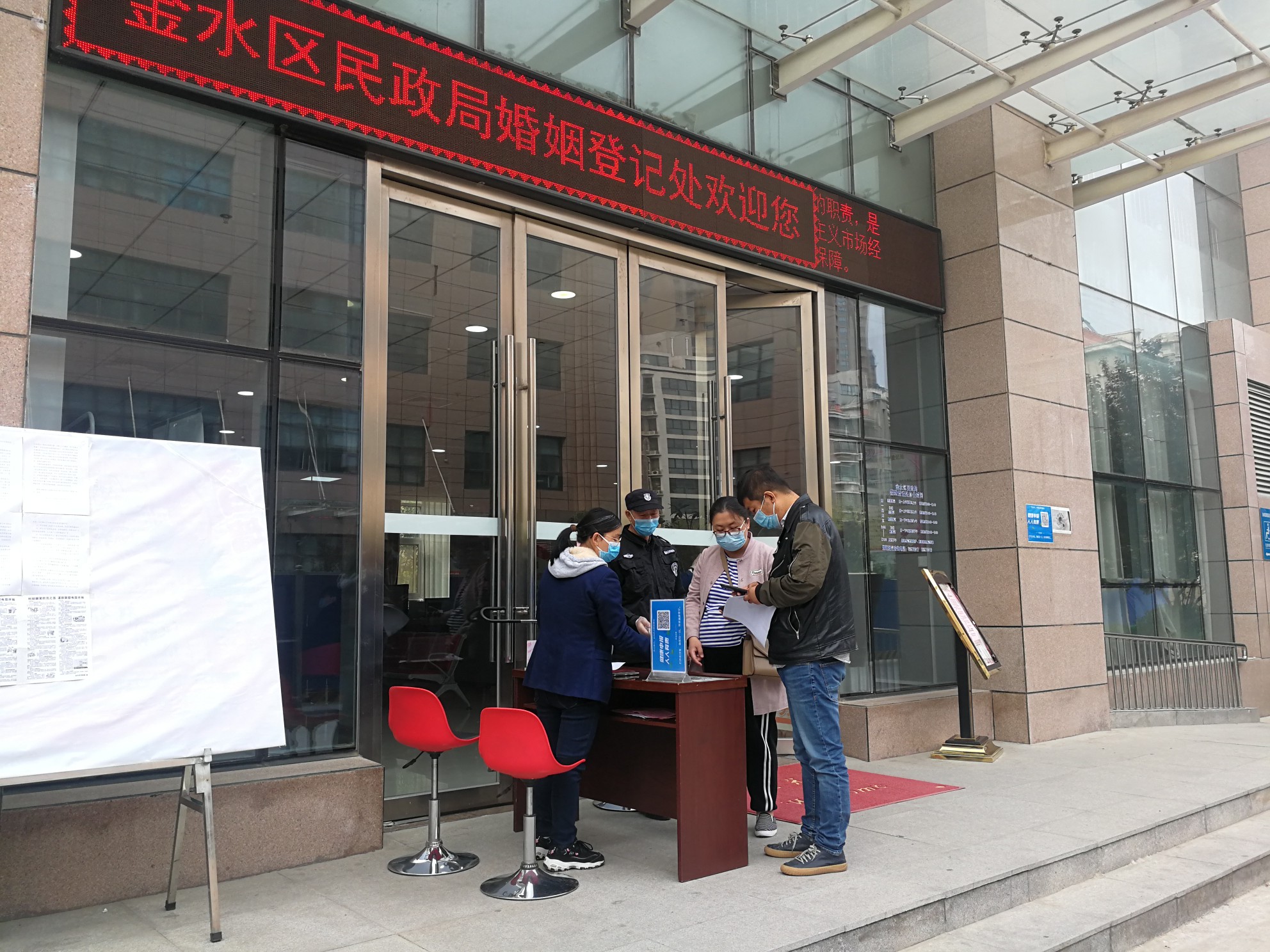 工作人员表示,疫情期间,金水区婚姻登记处工作人员一边按照上级指示,派人员下沉到高速路口、辖区多个小区门口值守,不畏风雨严寒,忙碌在抗疫一线,一边安排人员坚守岗位,答疑解惑,开展婚姻登记服务。非常时期,婚姻登记机关呼吁有需要的群众提前预约、错峰办理,采取电话预约的形式,调控登记数量,分批分段开展婚姻登记各项业务,同时,遇到真有特殊情况且手续齐全的特殊人群,能办理的也会尽量满足民众需求。全面复工以后,工作人员已全部从社区等抗疫一线调回,来不及休整,又投入到繁忙的婚姻登记工作中。