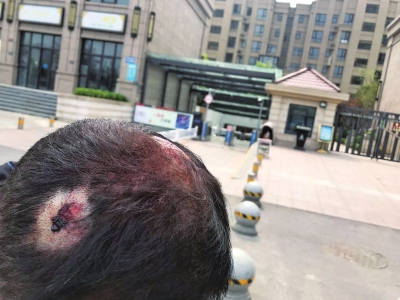 4月10日,记者在阳光城8号院北门,见到了受伤业主赵先生,赵先生头部的两处伤口已经结痂,上衣领口仍有大片血迹。据赵先生介绍,他身上还有其他伤口。