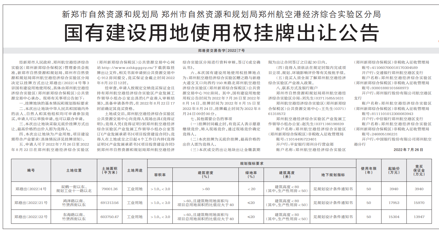 【大河财立方消息】 7月26日,新郑市自然资源和规划局、郑州市自然资源和规划局郑州航空港经济综合实验区分局公告称,决定以挂牌方式出让郑港出〔2022〕4号等3宗国有建设用地使用权。