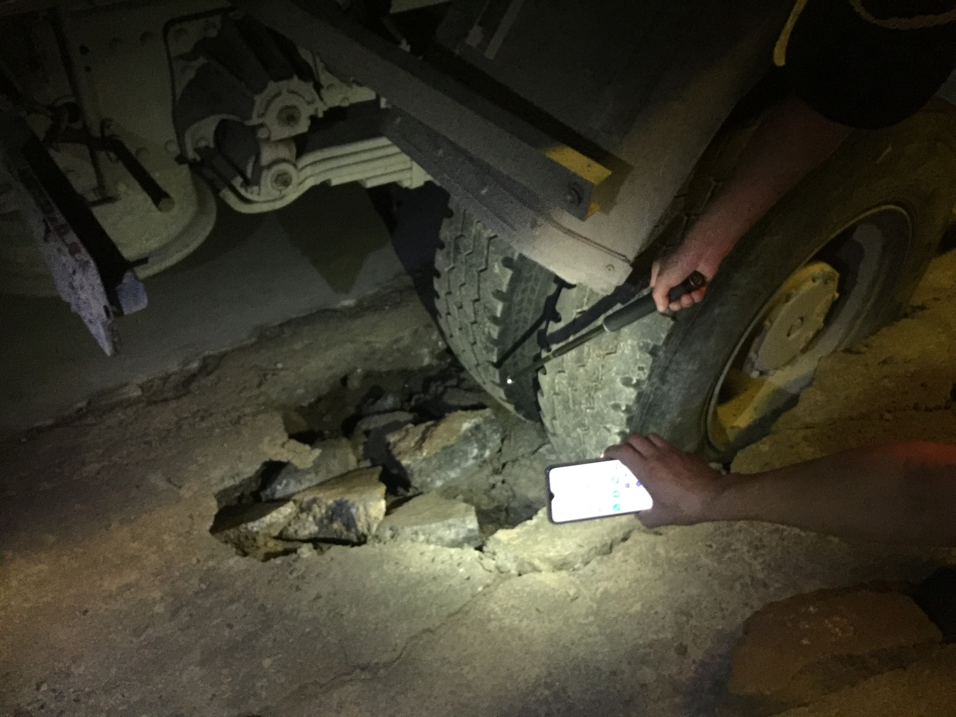 了解情况后,巡防队员赶紧随车主前往查看,发现货车右后轮陷进了塌陷的路面,车身明显向右侧倾斜。路面塌陷的原因,可能是因为近期频繁下雨,路面下方的泥土被冲空,满载货物的大货车经过时,路面不堪重荷塌陷。