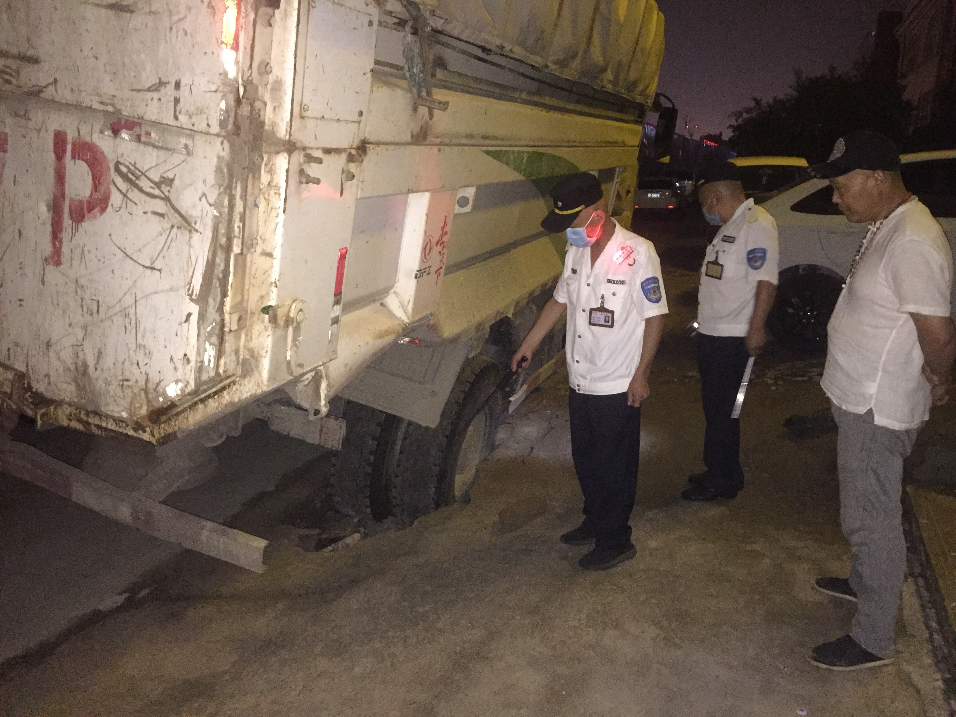 7月23日凌晨0时30分左右,金水区凤凰台办事处巡防队员海俊、张勇、董新春,巡逻到辖区中州大道与福元路交叉口南侧的一个小区门口,一男子慌忙上前求助,说他驾驶货车到小区送货,不料路面突然塌陷把车轮卡住,令他进退两难。夜里找不到人帮忙,他只能干着急。