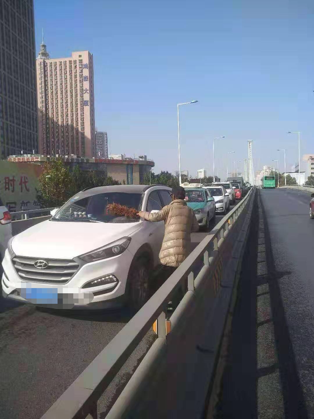近日,郑州市二七区解放路巡防中队队员巡逻至解放路立交桥下时,看到桥口处有一男子手持鸡毛掸,以掸挡风玻璃灰尘为名,向机动车驾驶员索要钱财,这样的行为不但对自己的生命安全构成威胁,也给驾驶员以及交通带来安全隐患。