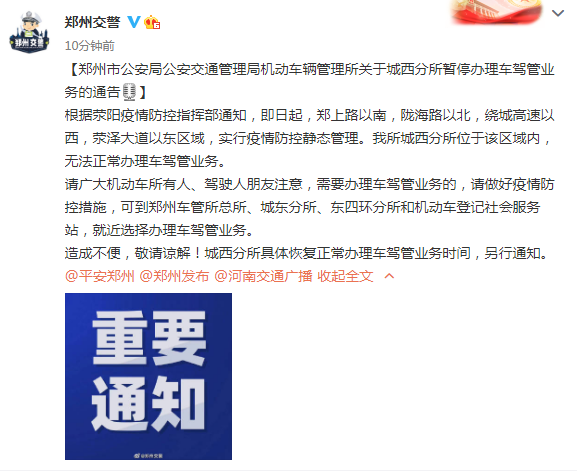 @郑州交警 今日发布通告,根据荥阳疫情防控指挥部通知,即日起,郑上路以南,陇海路以北,绕城高速以西,荥泽大道以东区域,实行疫情防控静态管理。郑州车管所城西分所位于该区域内,无法正常办理车驾管业务。
