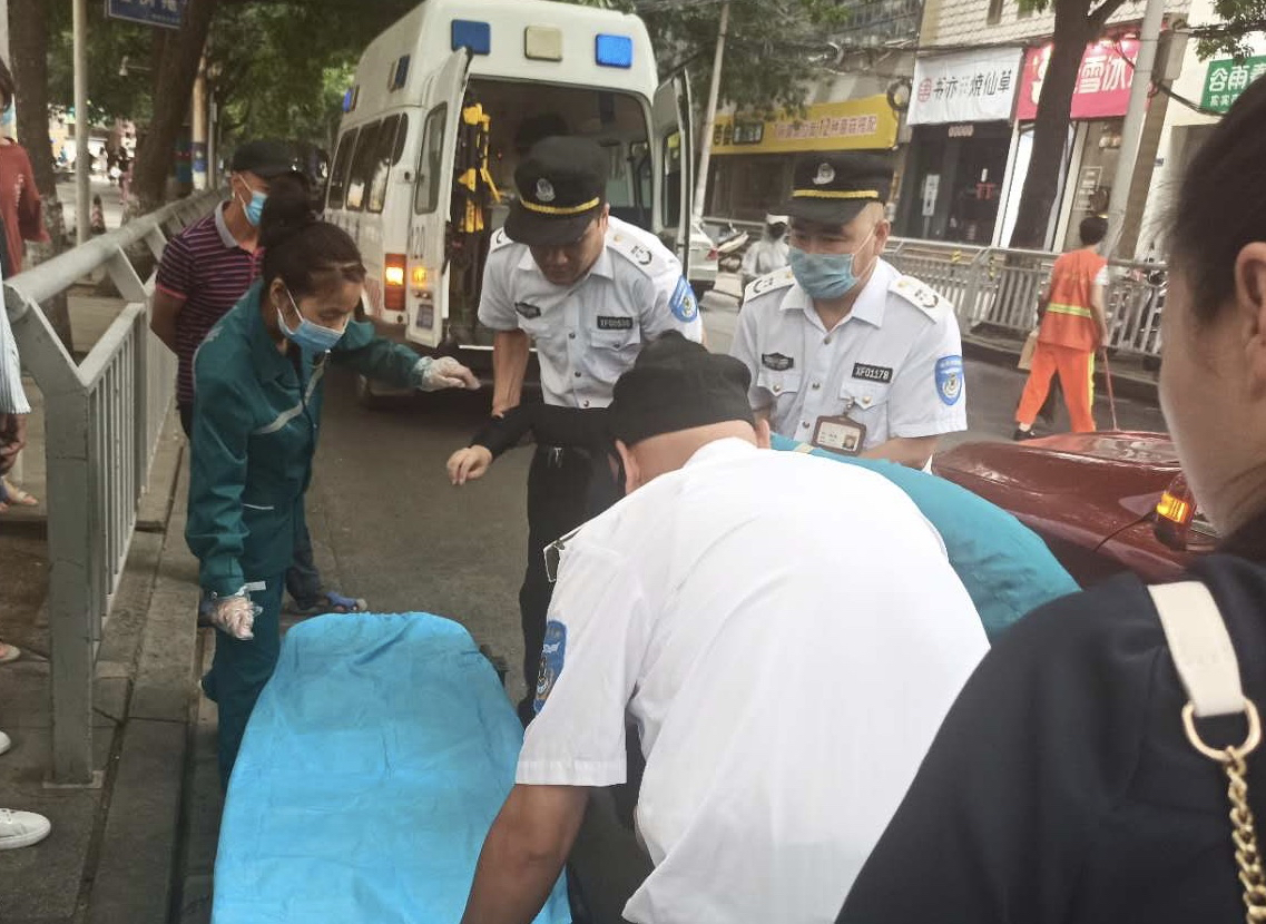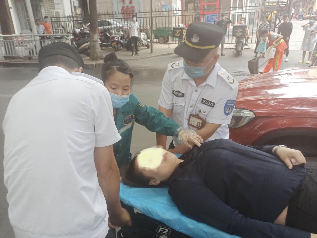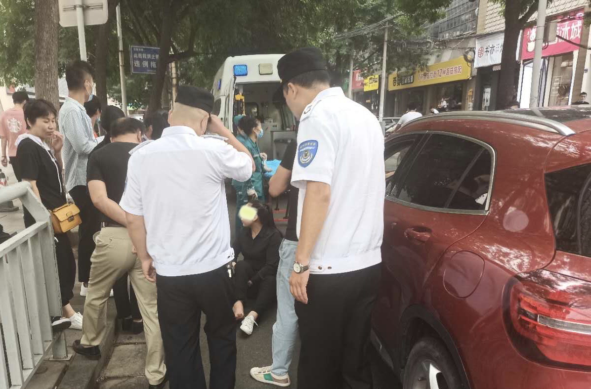 6月28日上午8:30分,金水区文化路办事处巡防队员秦苏荣、王知亮、王新苹,巡逻到花园路与丰产路交叉口西约100米处,突然听到有女子的惊叫声,扭头一看,发现一名女子抱着脚坐在地上,表情十分痛苦,说旁边一辆红色轿车从地下停车场出来向东拐弯儿太急,轧住了她的脚。