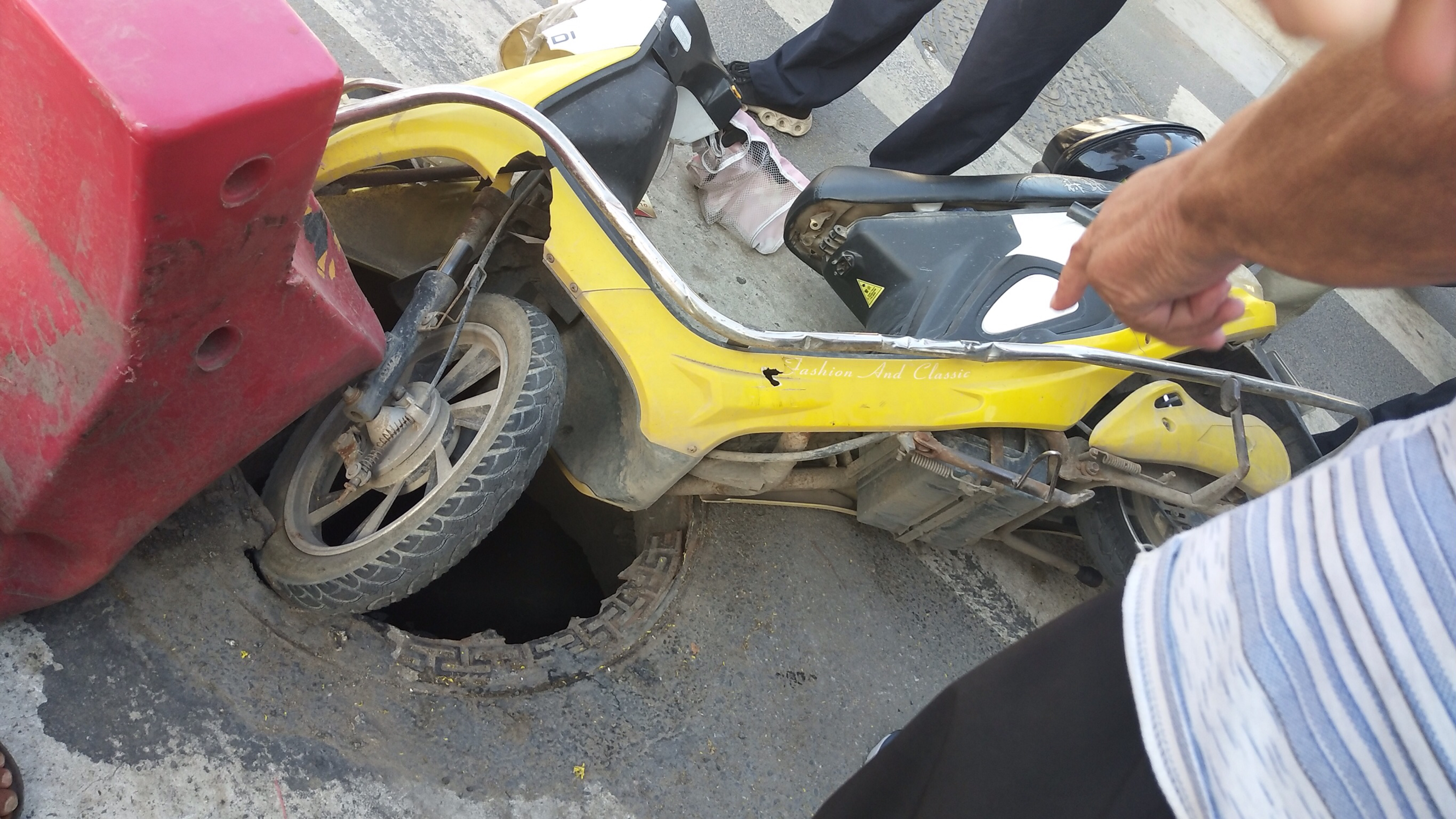 8月29日凌晨零时40分,郑州市中原区建设局扬尘办职工郁先生,骑电动车到辖区工地进行夜巡。途经西站路与朱屯西路交叉口时,因对面车灯太刺眼,无法看清路面情况,导致电动车轮卡入这口无盖的窨井里,当场从车上甩飞出去,左腿疼得无法动弹。