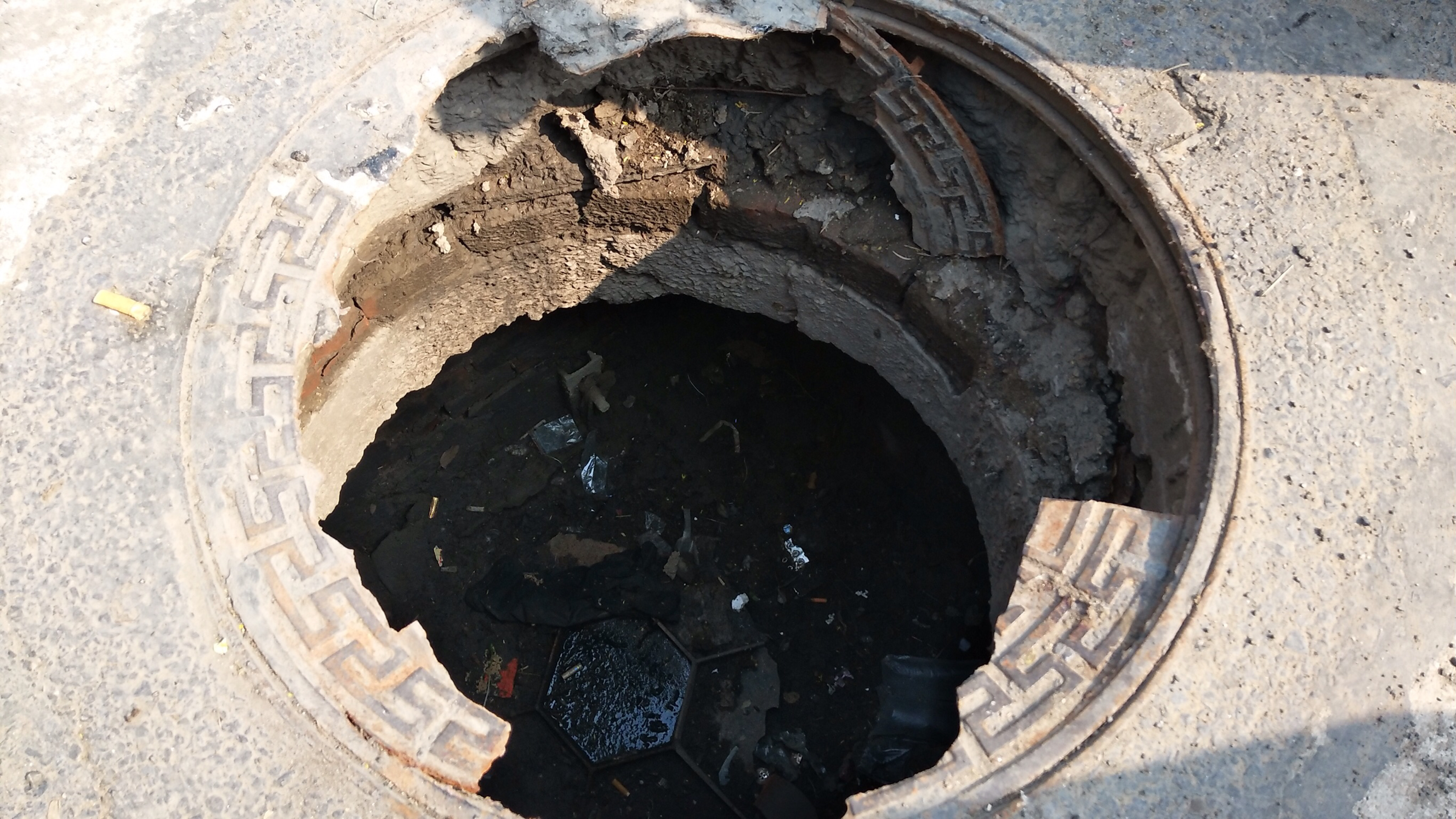 郑州一人行道上窨井“大张口” ,一直无人处理,今天凌晨“咬”伤人了