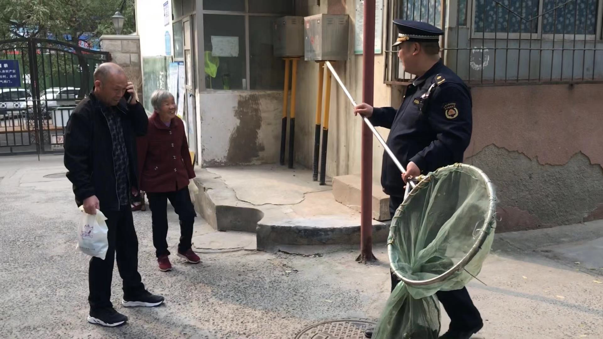 上午10点多,巡防队员在小区大门口遇上在辖区巡查的中原区林山寨行政执法中队的两名执法人员,巡防队员将险情反映给执法人员,接求助后,一执法人员立即赶回中队拿来专业捕狗长杆网兜赶到现场,将霸占楼道2个多小时的小流浪狗强行捕走。