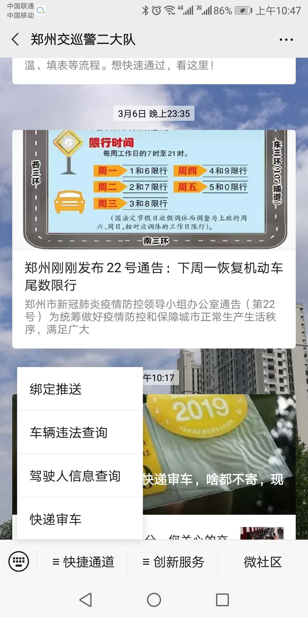 3月9日,记者从郑州市交警二大队获悉,从今天开始,该大队快递审车业务提前恢复微信办理,在微信平台申请通过后,市民什么都不用寄,后台民警办完后会通过快递公司将年检车标送达。