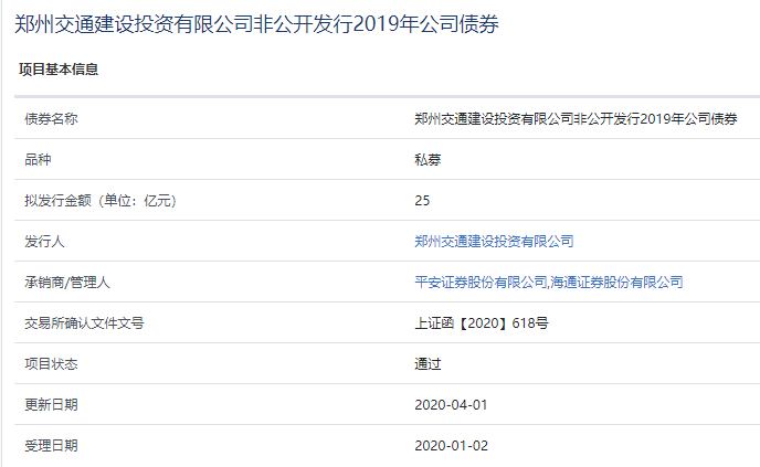 4月1日,据上交所公司债券项目信息平台显示,郑州交通建设投资有限公司非公开发行2019年公司债券项目,状态更新为“通过”。