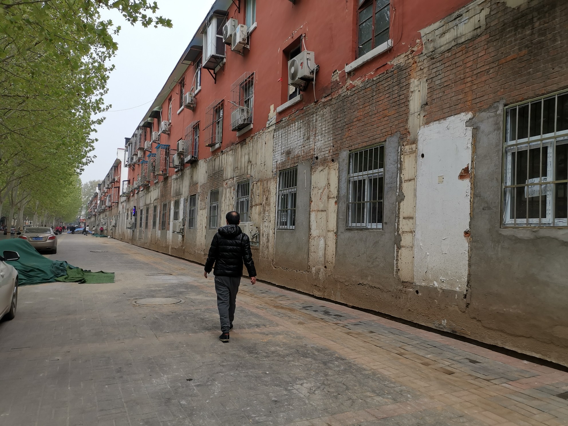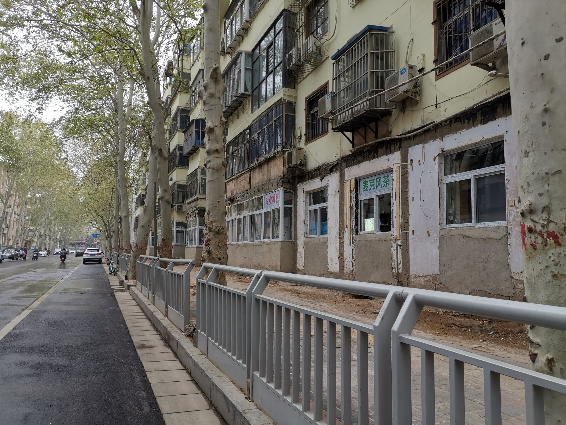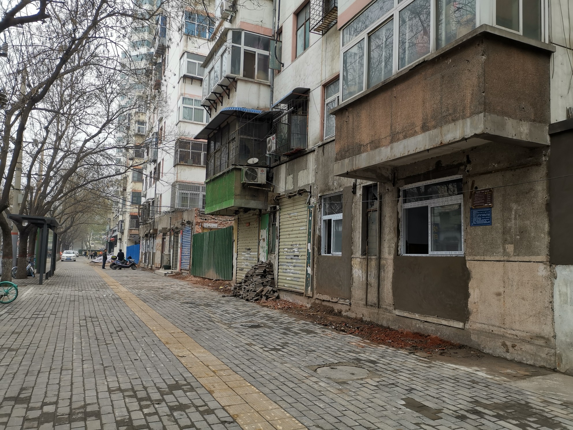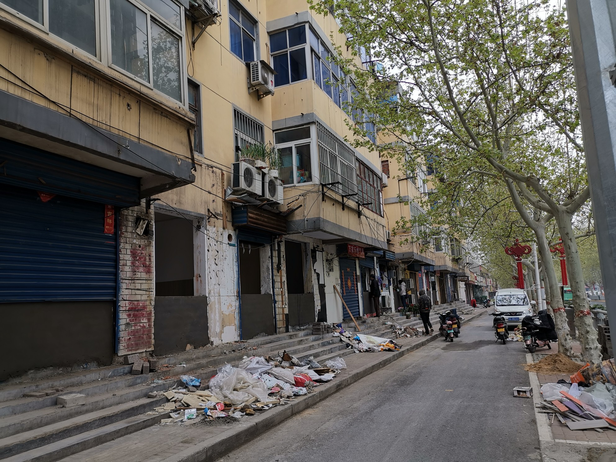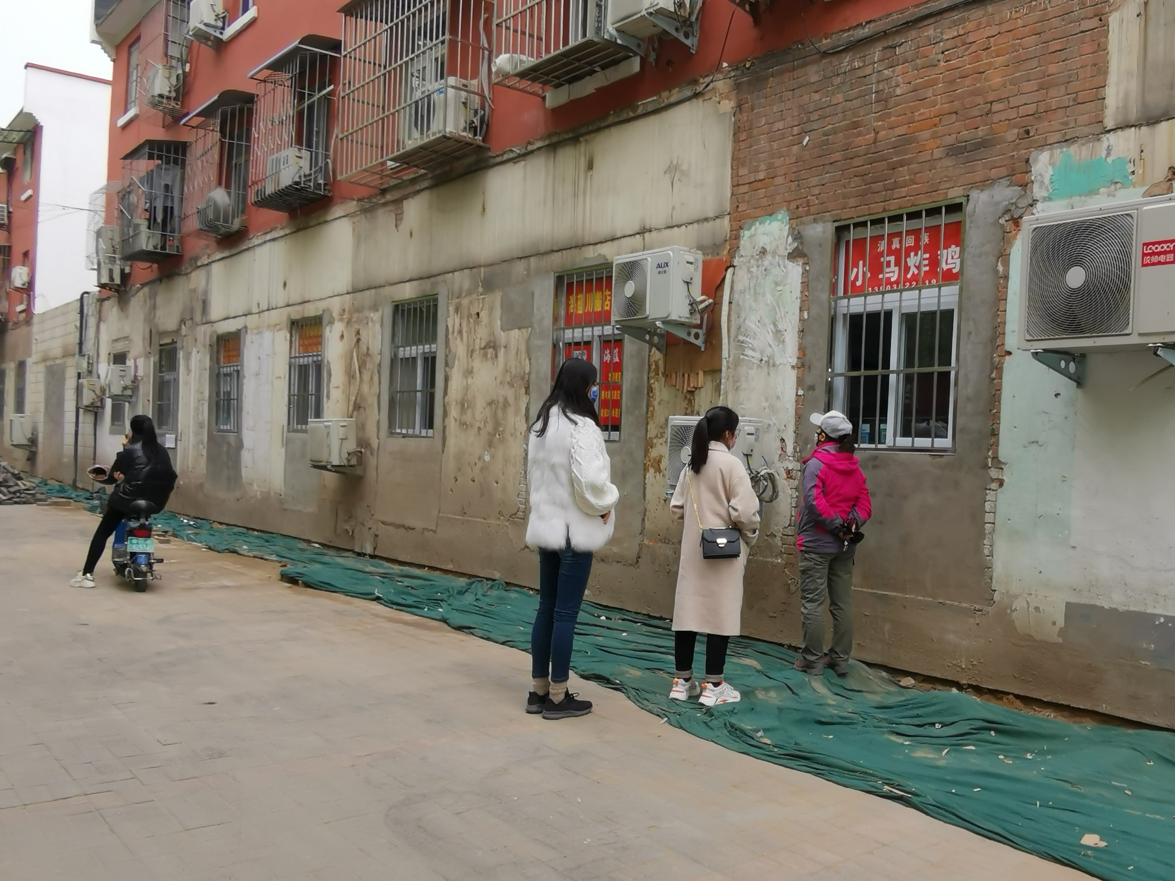 在郑州市西区前进路与市场街交叉口附近的前进路上,这里居民楼下曾有饭店、小吃店、理发店、烟酒店、小超市等二三十家商户,但此时,这里一个个曾被破开经营的窗户都被修补起来,遗留着光秃秃的墙面,灰色的水泥和旁边白色墙漆与楼上红色的墙壁显得格格不入。虽然人行道路面被重新铺设,但路上的行人却少了很多。一些零星商户仍在窗口经营,不少长期捧场的市民也会来此排队,享用依旧美味的小吃。