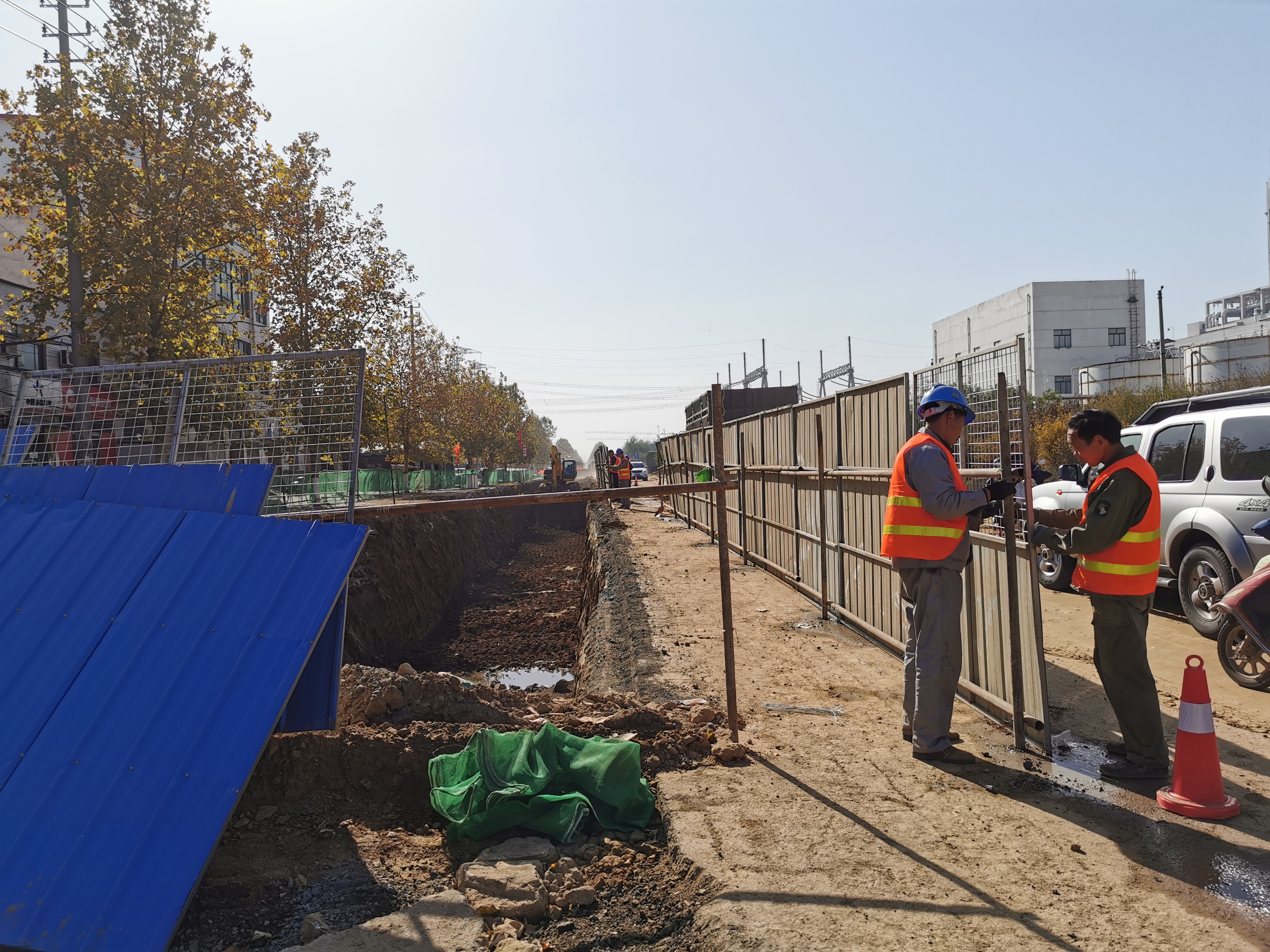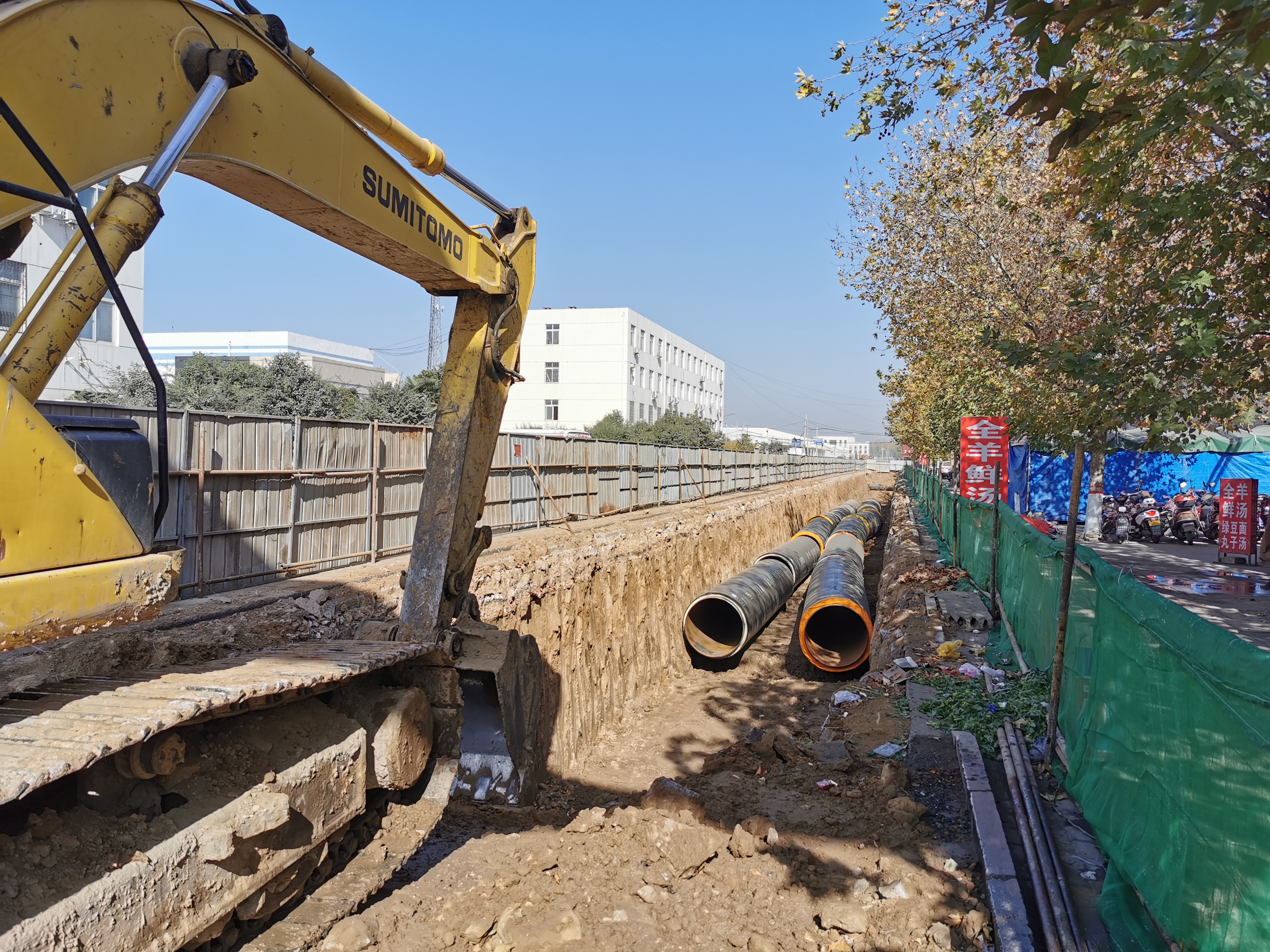 11月14日上午,记者驱车赶至位于新密市曲梁镇境内的裕中电厂外看到,一条呈南北走向的道路东侧,路面竖起蓝色围挡。几辆挖掘机停泊现场,围挡内侧路面,挖出一条约600米长、深约4米、宽约5米的沟槽。沟槽内,两根直径1.6米的“大个头"供热管网,则安放到位。