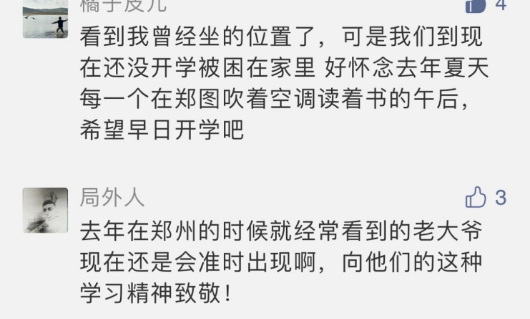 “我们到现在还没开学被困在家里,好怀念夏天在郑图吹着空调读着书的午后。”