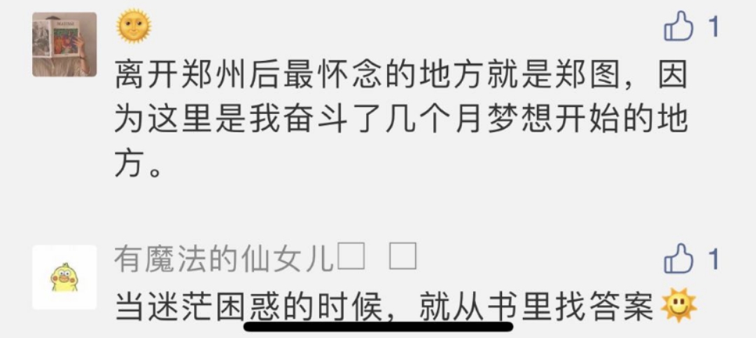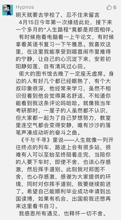 前不久,一位昵称“Hypnos”的读者,在郑州图书馆官方微信留言:“明天就要去学校了,忍不住来留言。我喜欢这里,在这里我能享受到喧嚣闹市里难得的宁静,让自己的心沉淀下来,安若初阳静如莲,自有清风过心田。偌大的图书馆去晚了一定座无虚席。身边的人有好几个都已经眼熟了,有个大叔印象很深,他经常来学习,虽然不相识但看到他会觉得莫名舒适,不知道你能看到我这条评论吗,哈哈。此刻我对郑图不舍,也心存感激,感谢为大家提供的环境,同时对你挥手道别,我要继续前进了。”