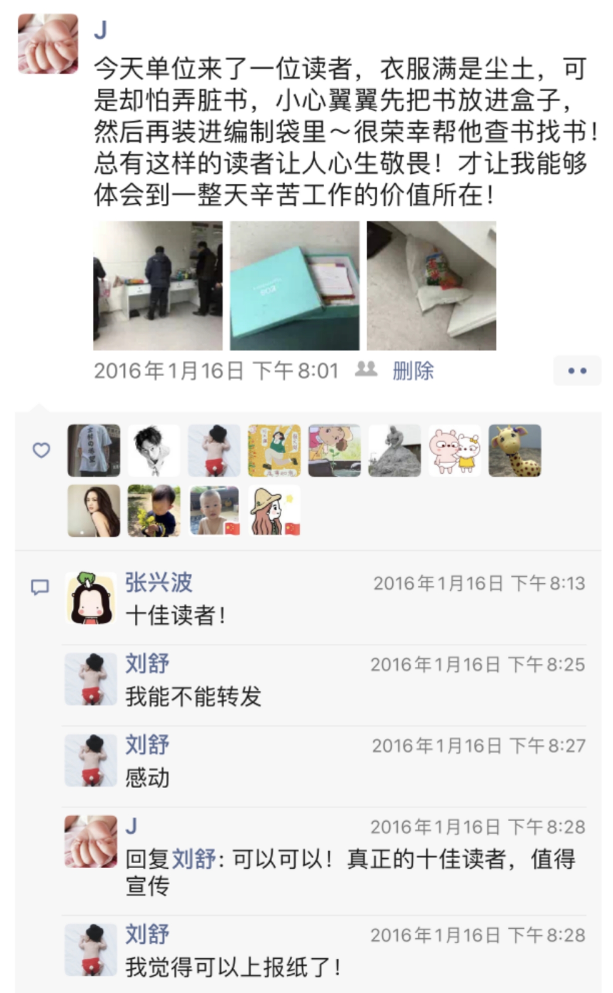 当晚,曹钰镜将图片发了朋友圈,并配文说:“很荣幸帮他查书找书!总有这样的读者让人心生敬畏,才让我能够体会到一整天辛苦工作的价值所在!”朋友们纷纷留言称“被感动了”。