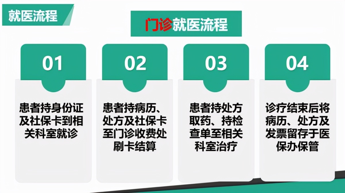 患者持身份证及社保卡到相关科室就诊→患者持病历、处方及社保卡至门诊收费处刷卡结算→患者持处方取药、持检查单至相关科室治疗→诊疗结束后将病历、处方及发票留存于医保办保管。