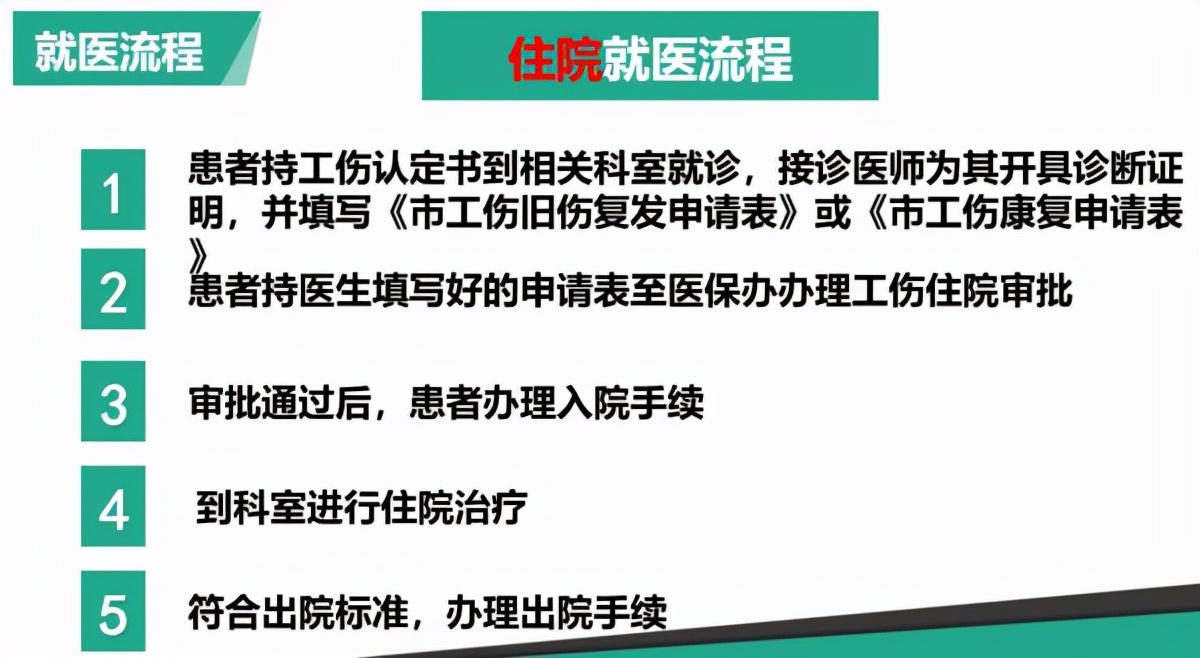 患者持工伤认定书到相关科室就诊,接诊医师为其开具诊断证明,并填写《市工伤旧伤复发申请表》或《市工伤康复申请表》→患者持医生填写好的申请表至医保办办理工伤住院审批→审批通过后,患者办理入院手续→到科室进行住院治疗→符合出院标准,办理出院手续。