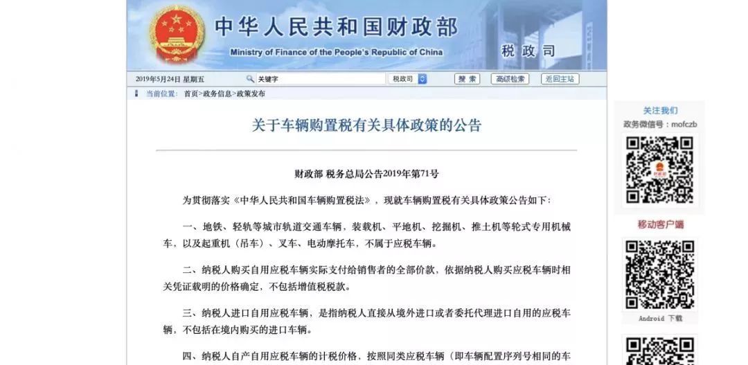 为贯彻落实《中华人民共和国车辆购置税法》,财政部、国家税务总局日前发布公告,明确关于车辆购置税有关具体政策。公告自2019年7月1日起施行。