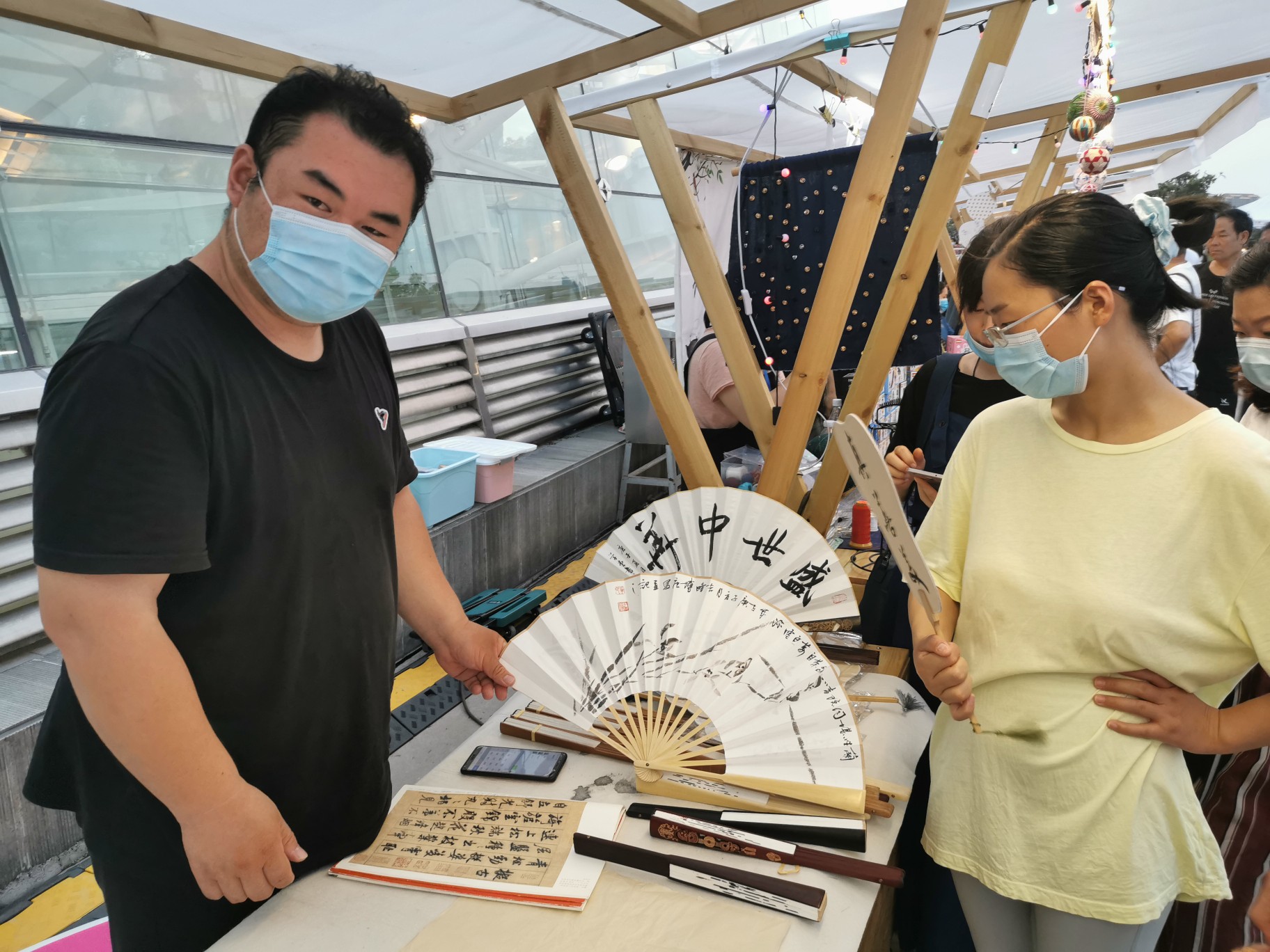 现场书法摊位的魏巍是郑州一名小学书法老师,他根据私人订制在扇面题字作画,吸引不少市民围观欣赏,在钤印落款时还会讲解几句印章知识。他说:“利用业余时间参与市集挺好的,展示自己的特长,为生活增添点乐趣。”