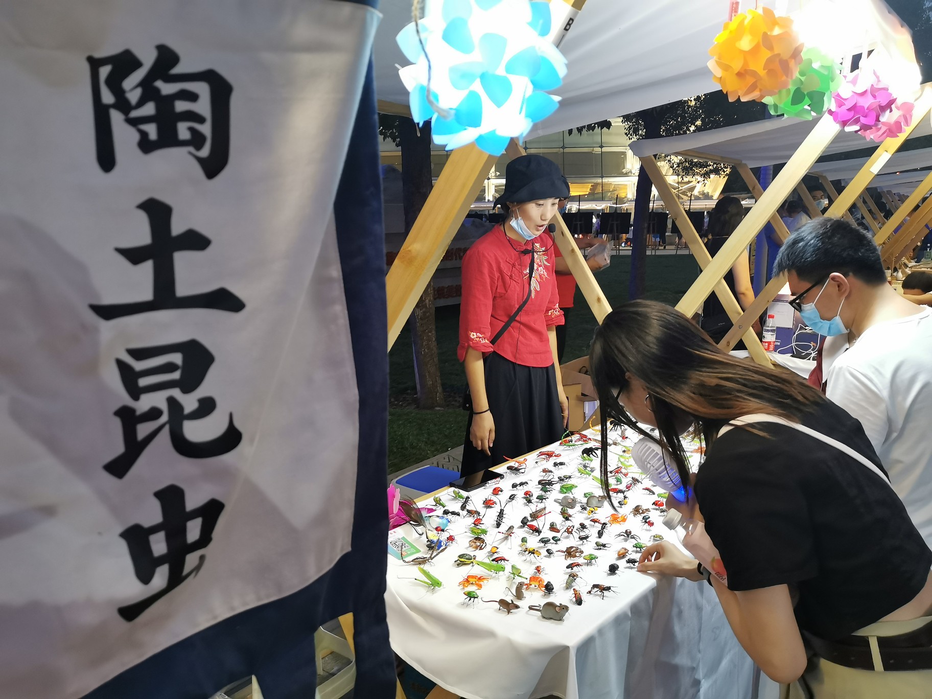 夜光照片打印、陶瓷文创、陶土昆虫……各家摊位推出了各自新颖有趣的文创产品、艺术创作、非遗体验等,好吃、好喝、好玩、好看的应有尽有。摊位的品类有老有新,既有汝瓷、烙画、面塑等传统非遗,亦有木制手作、潮品等文创杂货;参加的摊主有河南博物院这样的老牌文创,也有初次尝鲜体验生活的小资白领。