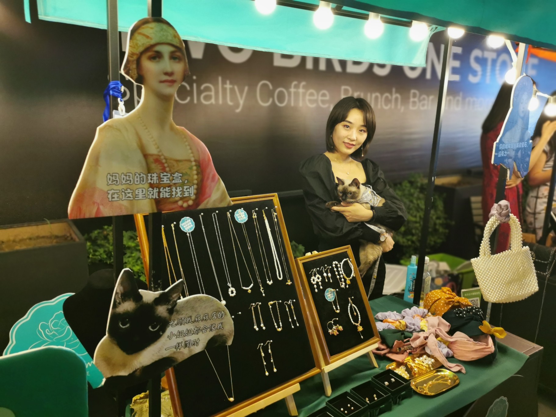 平面设计师吴婧傍晚下班后,回家抱上养的暹罗猫,赶到海汇中心摆上了复古珍珠摊位。