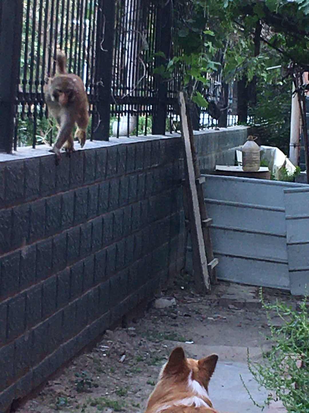 25日上午,在现场,绿东村街道巡防队员史强和队友闻讯赶来,试图捉住猴子,但是尝试了几次,宣告失败。“它忒机灵了,你稍微靠近一些,立即就拔腿跑了。一会儿沿着窗户上楼,一会儿爬院墙。简直像玩杂耍。”两名队员说,院子里的两条狗看到“敌情”,怒吼着与猴子展开对峙。也许猴子感到畏惧,只见它悄悄靠近狗后,旋即又赶紧离去。