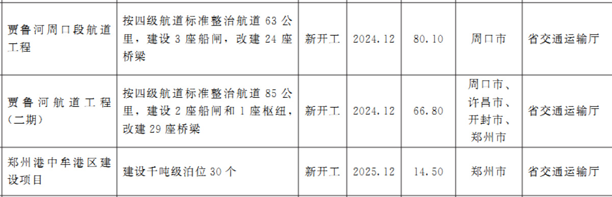 其中包括:贾鲁河航道工程(二期),按四级航道标准整治航道85公里,建设2座船闸和1座枢纽,改建29座桥梁,工程所在地位于周口市、开封市、许昌市、郑州市,预计开工时间2024年12月。