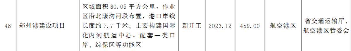 今年8月份,河南省政府办公厅发布的《河南省全面加快基础设施建设稳住经济大盘工作方案》(简称《稳经济大盘工作方案》)中明确提到,河南要在航空港区建立国际化的内河航运中心——郑州港,配套一类口岸与综保区功能,面积约30平方公里,作业区沿北康沟河段布置,港口岸线长度7.7千米,开工时间2023年12月。