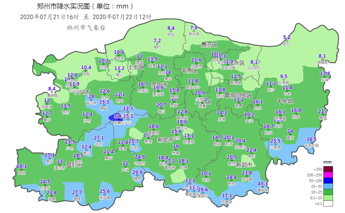 根据郑州市气象台统计,7月21日16时至7月22日12时,郑州市出现中到大雨,新密的伏羲山出现暴雨,雨量52.5毫米。雨量较大的站点有(毫米):郑州的尖岗水库20.9、侯寨14.2、港区的三官庙25.5;中牟县的千禾农场38.5、黄店24;新郑市的香炉朱村45.3、观音寺37.3;新密市的伏羲山52.5、牛店25.7;荥阳市的环翠峪33.3、塔山20.7;登封市的嵩山32.4、佛垌29.9;巩义市的南岭35.3、蝴蝶谷28。