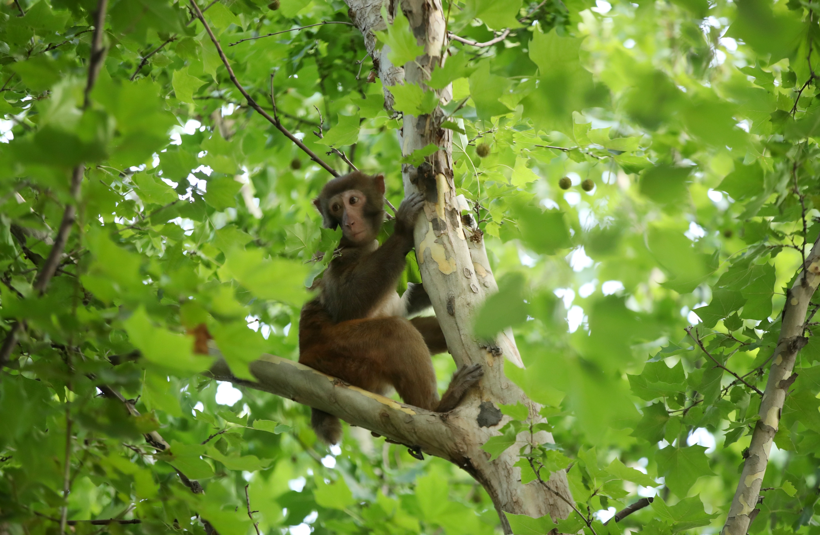 下午4点半,工作人员赶到现场,拿出苹果、桃子放在地上,试图引诱猴子下来,但不论如何引诱,机灵的猴子坐在树杈上的,一会抓抓痒,一会晃晃树枝,东张西望。小家伙一会儿看看苹果,一会儿看看人群,似乎只要人在,美食再好也诱惑不动。