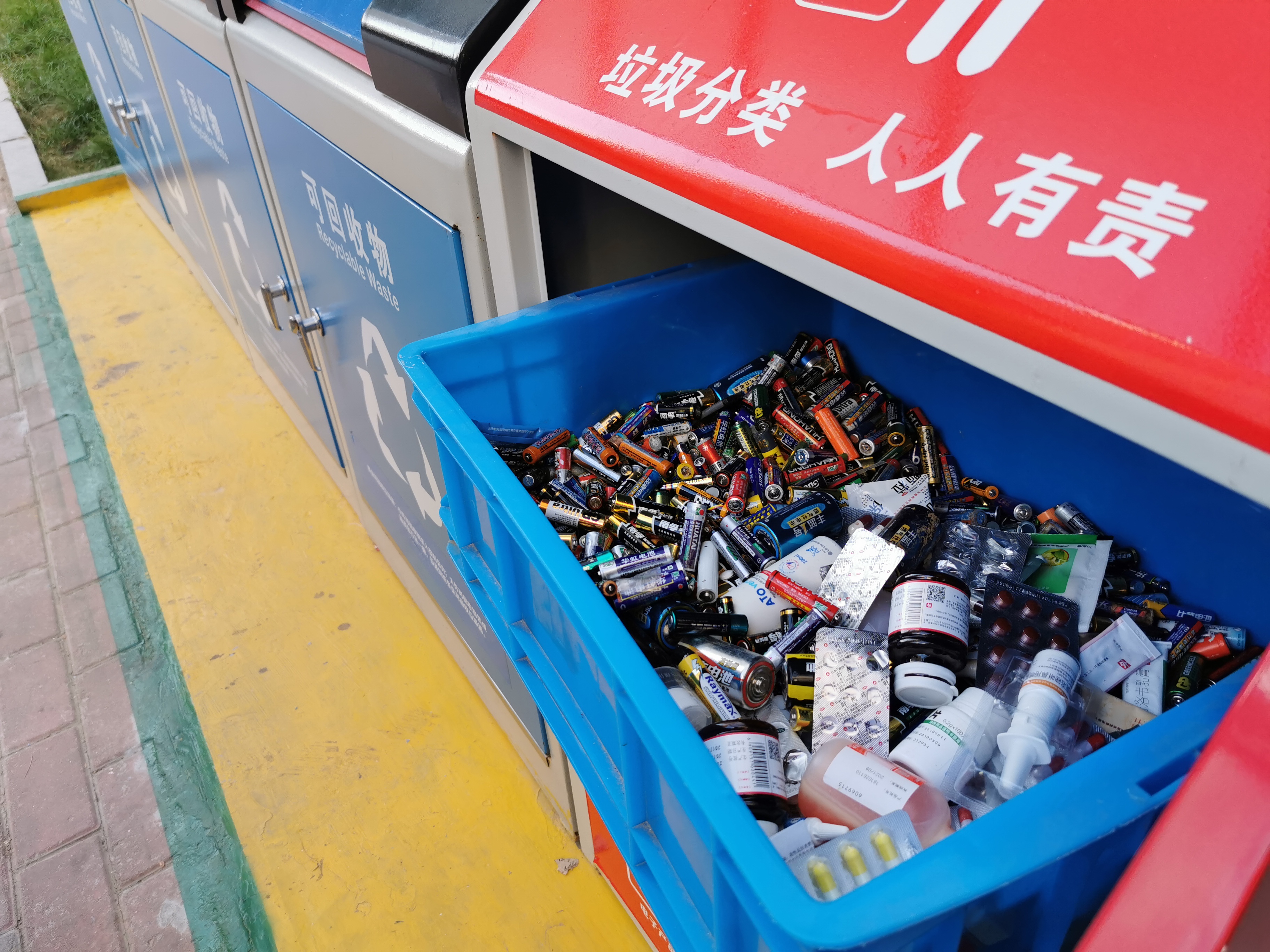 在现场,刘女士眼前摆放着4个垃圾桶,其外观洁净明亮,桶体上分别写着餐余垃圾、可回收垃圾、其他垃圾、有害垃圾。这些垃圾桶,均是密闭摆放,居民投放垃圾的的时候,可自行刷开开启,也可以示意旁边的工作人员,帮忙开启。可回收垃圾桶内,居民投放了数十个饮料瓶、纸箱等;有害垃圾桶内,则是几乎摆满了过期药品、废旧电池。