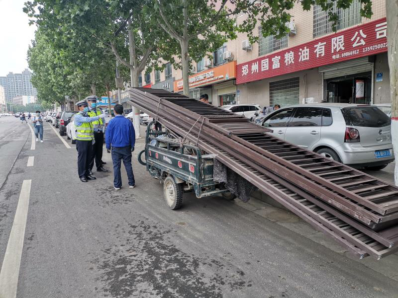 5月6日,一男子低头弯腰驾驶着一辆电动三轮车,车上不仅超载超长装着约10米长的铝合金架外,还挤着两名成年乘客,让路人都为他们捏把汗。在路口执勤的新密交警发现后,立即叫停,当场对司机和两名乘客进行了批评教育,并依法对司机进行了处罚。