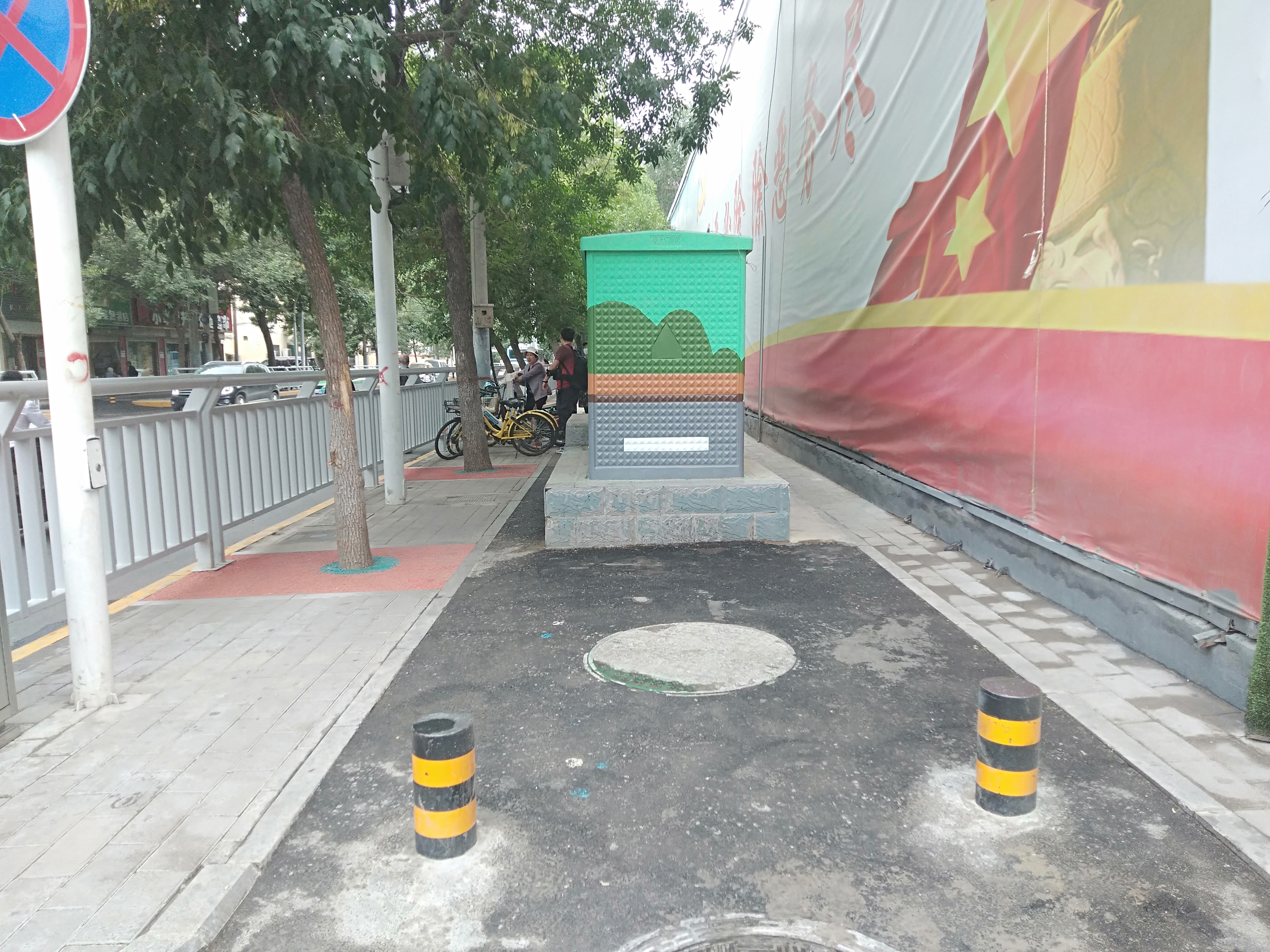当天上午11点多,两名供电部门的工作人员赶到现场,查看两个配电柜后称,此处是高压配电柜,里面是变压器。当初建的时候挨着路边,之前啥也没有,更不用说非机动车道和人行道了。东明路扩路的时候,扩到这边了。