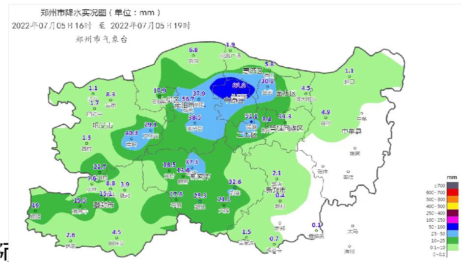 根据监测,7月5日16时至19时,最大降水出现在郑州市区的外国语81.8毫米。降水量在50-99.9毫米的站点有7个,25-49.9毫米的站点有20个,10-24.9毫米的站点有48个。