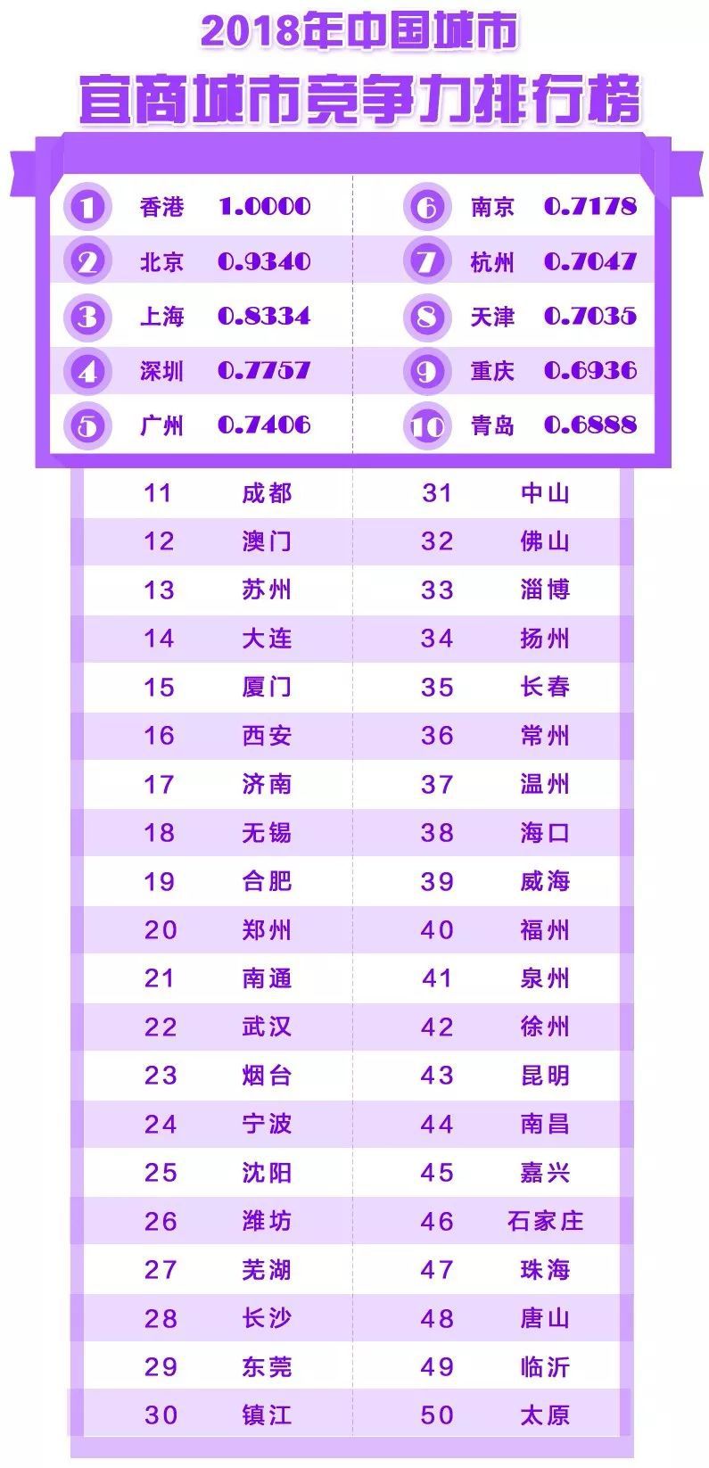 意料之中,城市宜商竞争力前五位的是香港、北京、上海、深圳和广州。第6名到第20名城市的宜商竞争力水平较为接近,竞争激烈。郑州排第20名。
