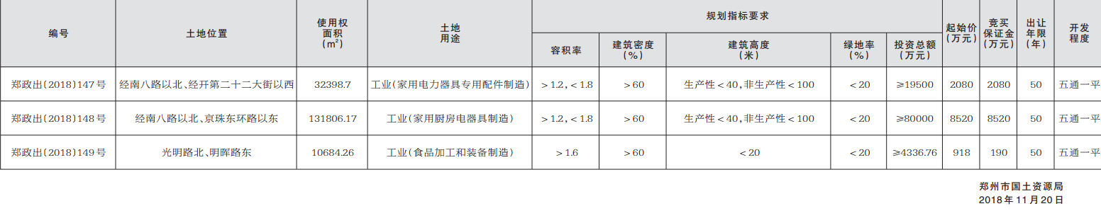 11月20日,经郑州市人民政府批准,郑州市国土资源局决定以挂牌方式出让郑政出〔2018〕147、148、149 号地块的国有建设用地使用权。