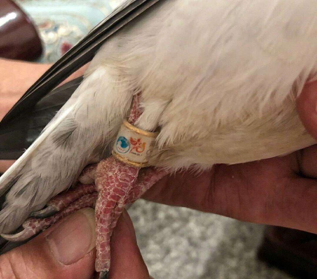 回家仔细检查后,她发现这羽鸽子的右脚上套着一个小环,环上有“70周年纪念环”的文字,文字旁边还有一个小标志,标志下方有“1949-2019”的文字。臧女士怀疑这是一只参加了庆祝大会后放飞的鸽子。她在家里找了一些花生米、小米、玉米粒、水等食物来犒劳这只鸽子,可鸽子不吃也不喝,还有点拉稀。臧女士想尽快找到鸽子的主人,就第一时间发布了消息并在网上求助信鸽协会的人员寻找鸽子的主人。