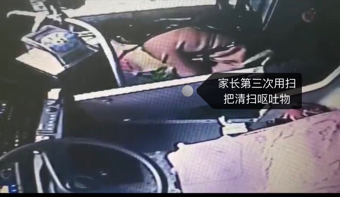 当这位母亲蹲在地板上,用双手认真地将呕吐物一点一点清理出去时,可爱的孩子乖乖地站在前排座椅旁边看着妈妈。