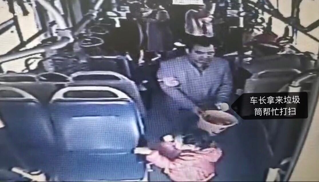 为了不影响乘客的乘坐舒适度,孩子的母亲和车长已分头行动,一个到站台找来了洒水壶,一个到车厢里拿来了扫把和垃圾桶,一起努力的清理。