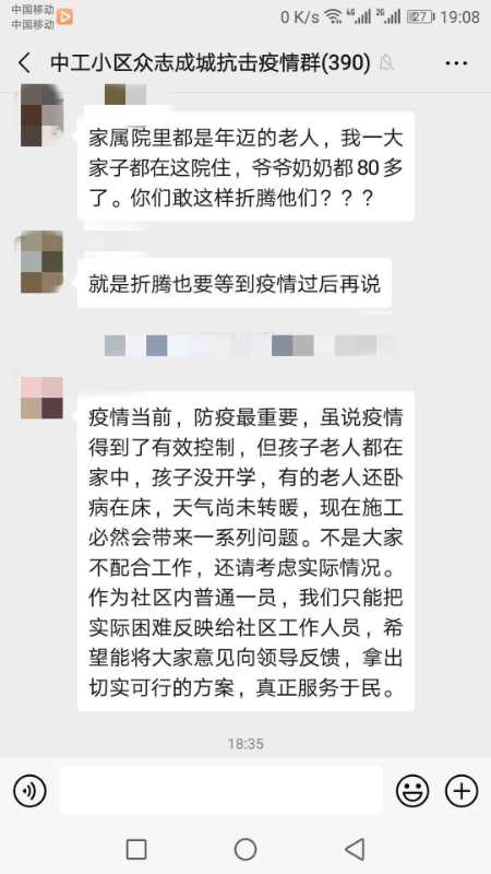 相关单位为了改善居民环境,初衷是好的,居民们也愿意配合,但疫情特殊时期,大多老人孩子都在家里,施工改造,势必会影响大家的生活。等疫情完全结束后,再进行施工作业,难道就不行吗?