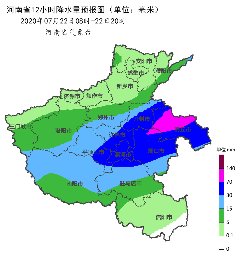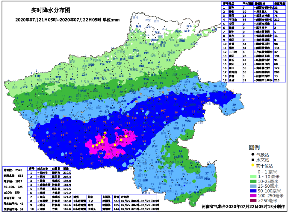 7月21日5时—22日5时,我省黄淮之间出现暴雨、局地大暴雨,强降水中心位于南阳、平顶山、驻马店、漯河到周口一带。据省气象台统计数据显示,全省有675个乡镇降水超过50毫米,大于100毫米的150个,舞钢市长岭头最大210.5毫米,泌阳王店1小时最大雨强为68.3毫米。郑州市区降水量5毫米。