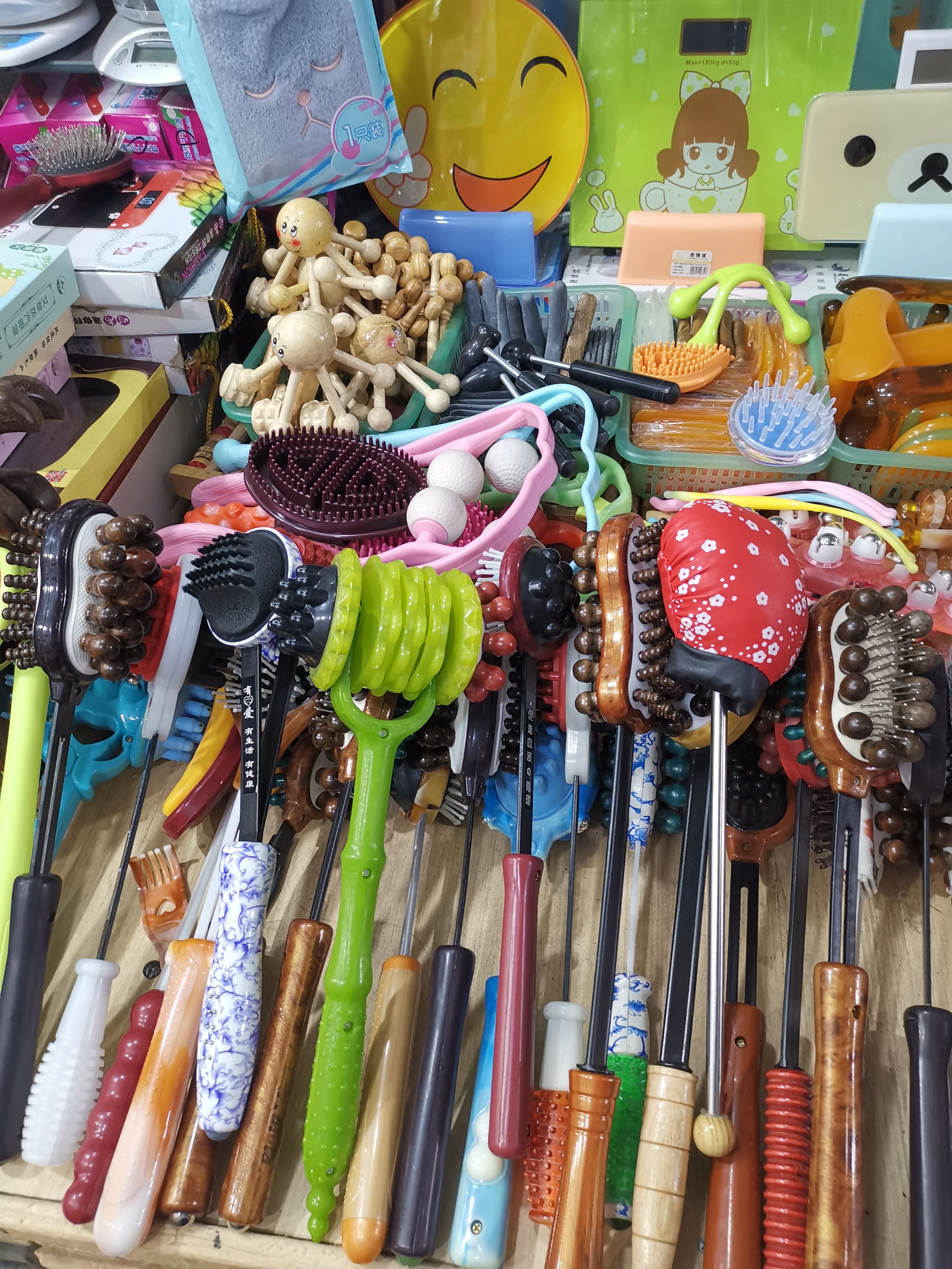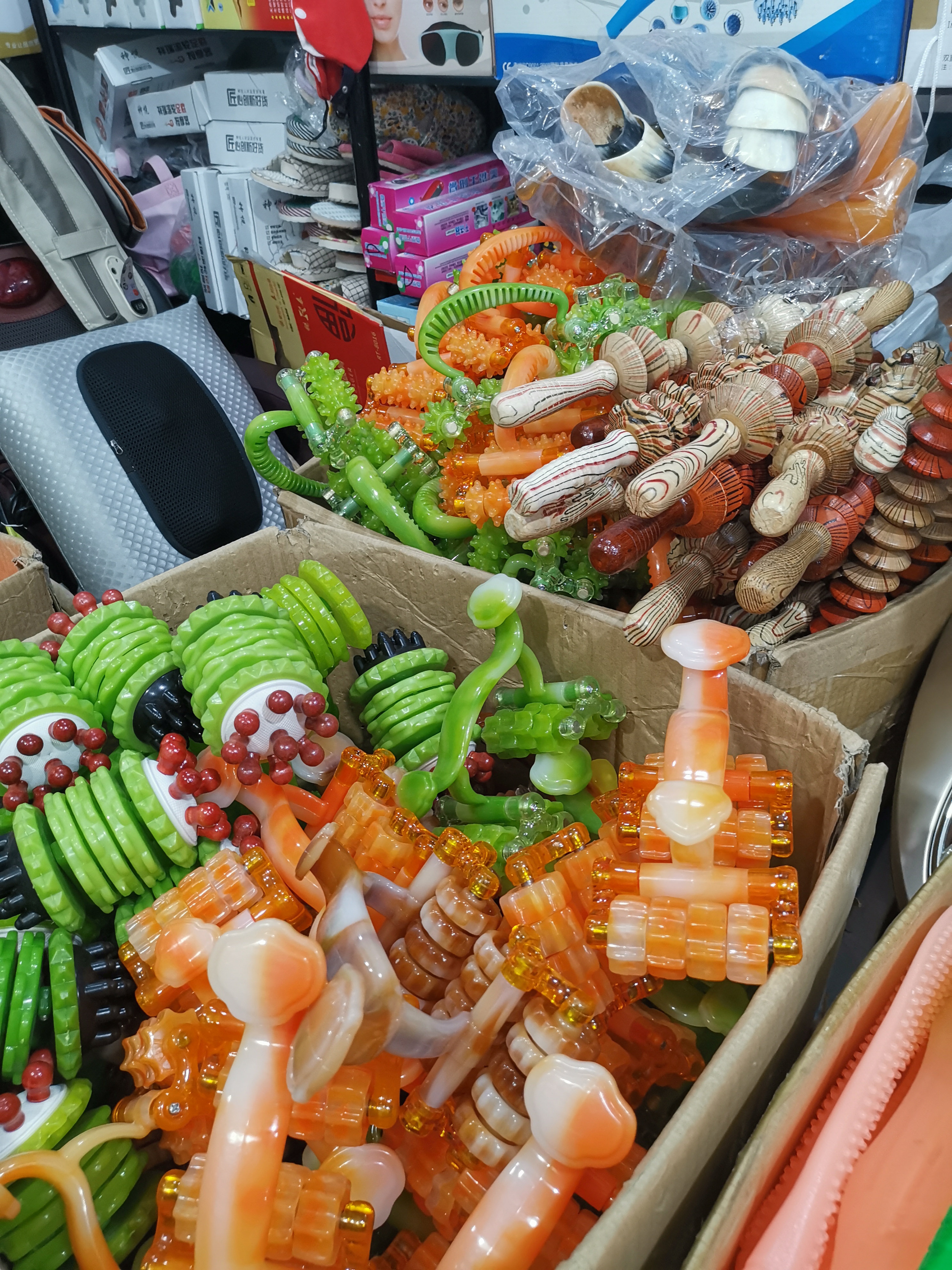 为了解市场上所销售的按摩产品情况。连日来,大河报·大河客户端记者对郑州市健康路夜市、火车站附近批发市场的按摩产品销售摊位和批发门店进行了走访,发现夜市摊上和市场批发门店内在售按摩产品种类繁多,除了需要通电使用的按摩棒、按摩垫、颈肩按摩器等电动按摩产品外,还有很多无需通电的塑料、木质、石质的按摩捶和按摩轮。但在这些按摩产品中,部分通电使用的按摩产品全是英文标识;且很大一部分塑料、木质、石质的按摩捶、按摩轮不仅没有合格证,连外包装都没有。