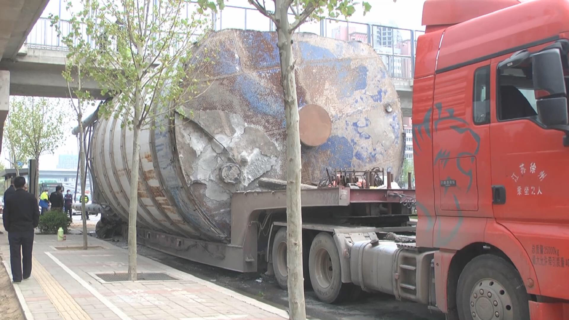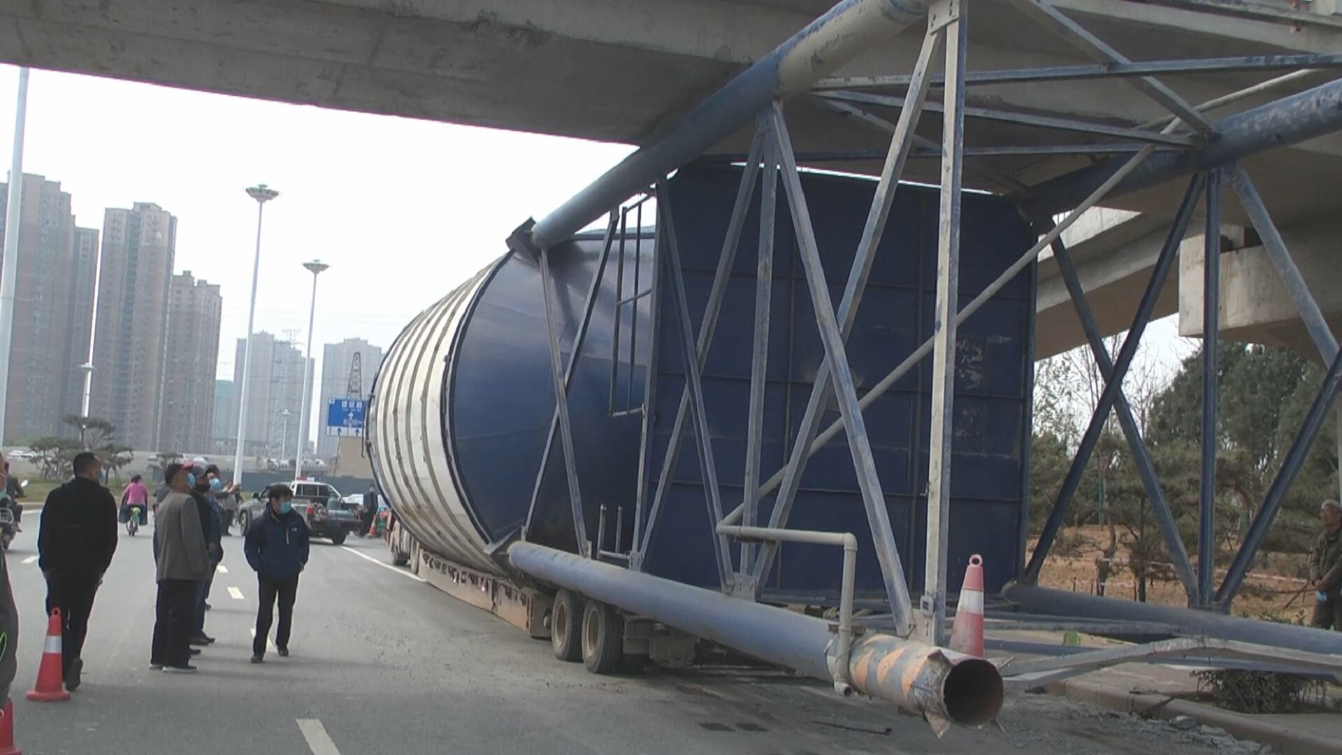 4月5日早上5时30分左右,一辆大货车拉着一个直径约6米、长约30米的巨型水泥大罐,行至郑州市西三环与化工路交叉口南约100米的人行天桥下时,因车上水泥罐的高度超过了人行天桥的高度,导致大货车连同巨型水泥罐被死死卡在桥下,无法动弹。
